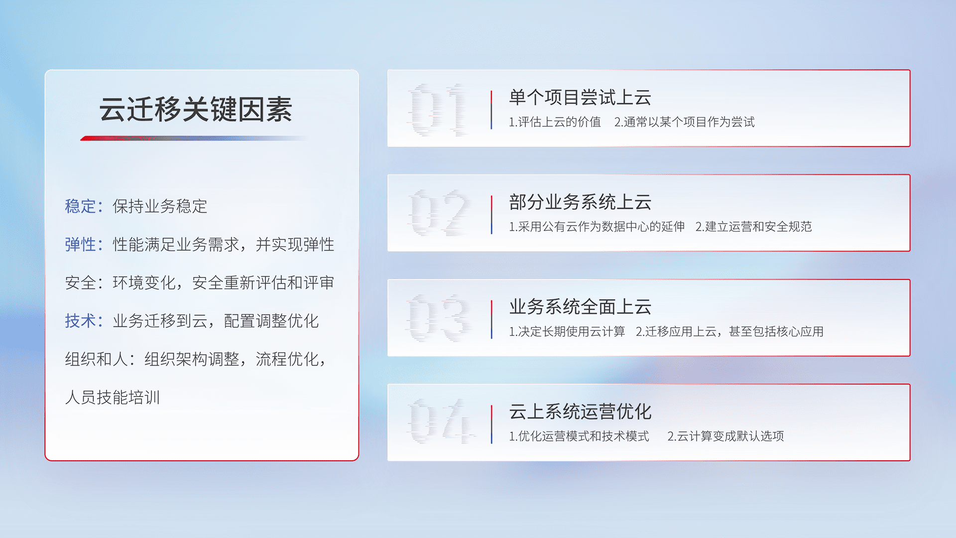 结合实际业务,,,,从规划设计、、云平台选型、、、云原生改造、、数据迁移、、、、集成交付,,迁移全过程为客户识别最佳上云路径,,,,做好风险识别管理,,,设计网络架构、、身份权限、、安全审计合规、、、、操作审计、、、、日志审计、、监控告警策略、、、多站点容灾设计等,,,对云上基础设施进行整体规划,,,,提升IT治理水平,,以满足弹性、、、高可用、、、、高性能的需求。。。。